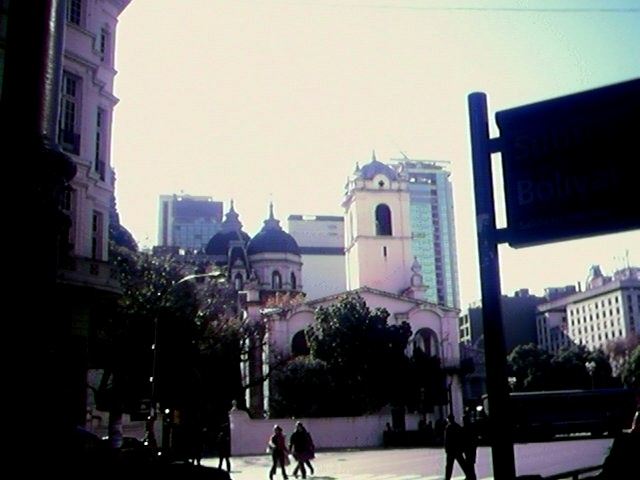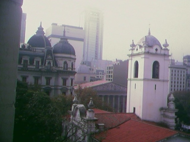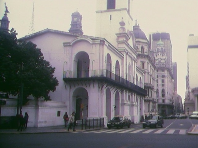 DESDE LA IZQUIERDA: EL EDIFICIO CON LAS DOS CÚPULAS CORRESPONDE AL DE LA JEFATURA DE GOBIERNO DE LA CIUDAD DE BUENOS AIRES. LA CÚPULA DE LA DERECHA SE RECORTA SOBRE LA PARED CIEGA DEL BANCO RIO. ESTA PARED DEL BANCO RÍO SE HIZO ASÍ POR DECISIÓN DE SU ARQUITECTO MARIO ROBERTO ÁLVAREZ A EFECTOS DE QUE LA CATEDRAL TUVIERA UN FONDO LISO QUE NO DISTRAJERA LA ATENCIÓN VISUAL DE LA MISMÍSIMA FACHADA DE LA CATEDRAL. (yo trabajaba como dibujante proyectista en el Estudio del Ingeniero Molteni (ESTIC) con los Ings. Prieto, Pestchanker y Ruda, cuando se tomó tal decisión, así que lo sé de primera mano. Tuvimos que cambiar todos los planos de todas las plantas que a la fecha ya se habían confeccionado) LUEGO ABAJO LOS TECHOS DE TEJAS ESPAÑOLAS DE LAS SALAS DEL CABILDO. ARRIBA DE ESTOS LA FACHADA DE LA CATEDRAL DE BUENOS AIRES Y POR FIN LA TORRE DEL CABILDO. |