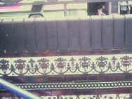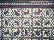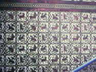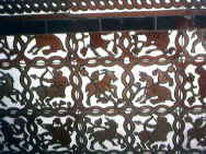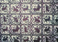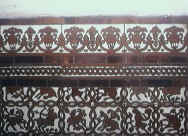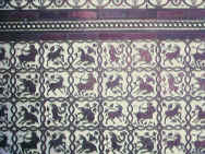 | Estas serían piezas de reposición ya que el dibujo es mas grosero, está en relieve y es de color marrón plano. Además se ve como terminan cortadas, bajo la guarda. El revoque de la pared está desprolijo en el encuentro. | Estas, en cambio, parecen ser las piezas originales. Su dibujo es más delicado, están en bajorelieve y el color es entre bronceado y verdoso con reflejos de tornasol. | ||||||||||||||||||||||||||||||||||||||