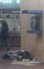 4-octubre-2006.- Lo habitual de esta situación se puede inferir en la actitud de la gente que marcha al lado de los tres durmientes sin prestarles atención.